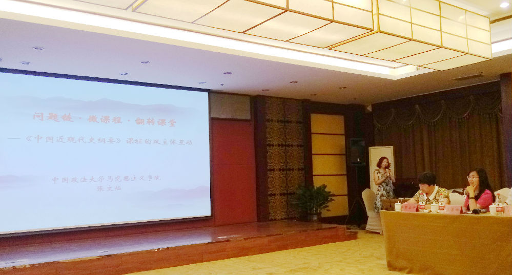 张文灿老师、赵庆杰老师应邀赴会。张文灿老师在会上以《问题链×微课程×翻转课堂》为题专门介绍了“中国近现代史纲要”课程的教学改革经验,获得了与会代表的热烈反响。