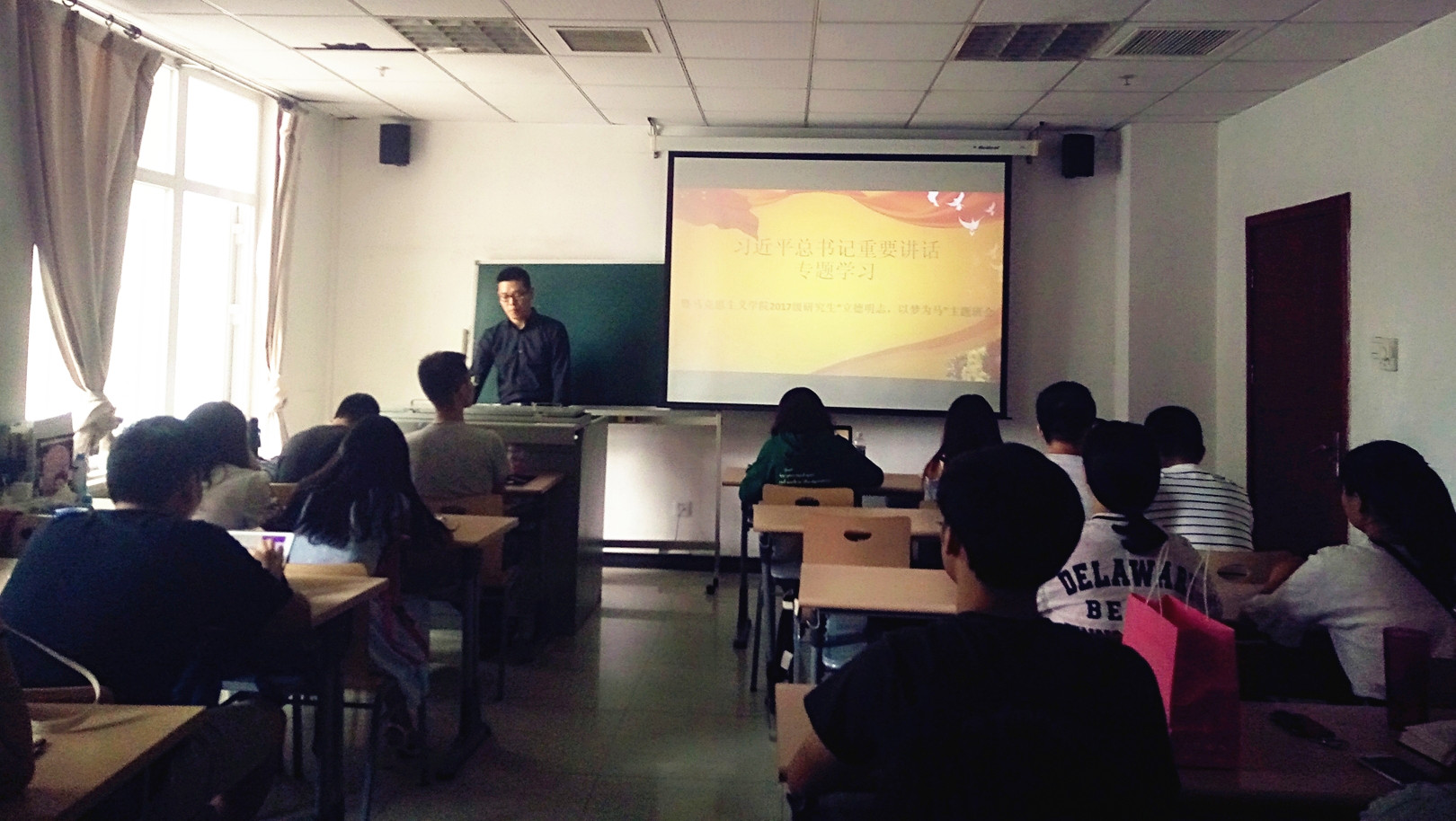 2017级研究生新生在新一号楼C102召开习近平总书记“5•3”重要讲话精神专题学习活动,暨“立德明智,以梦为马”主题班会,会议由2017级硕士党支部书记姜浩主持。