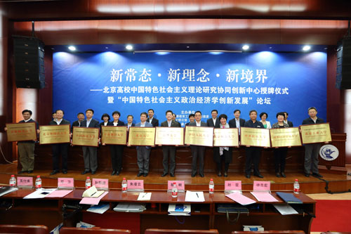 5月6日,北京高校中国特色社会主义理论研究协同创新中心授牌仪式暨中国特色社会主义政治经济学创新发展论坛在中央财经大学举行,11所北京高校中国特色社会主义理论研究协同创新中心正式成立。我校党委副书记、纪委书记、“北京高校中国特色社会主义理论研究协同创新中心(中国政法大学)”主任胡明教授率队参加会议。