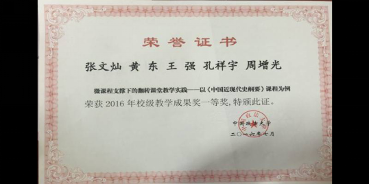 中国近现代史研究所申报的“微课程支撑下的翻转课堂教学实践——以《中国近现代史纲要》课程为例”获2016年度教学成果一等奖。