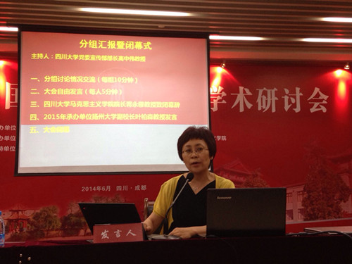 2014年6月6日—8日,全国思想政治教育学术研讨会在成都举行。来自全国多所高校和研究机构的专家学者170多人参加了研讨会。会议由中国社会科学院马克思主义研究院主办,四川大学开元体育 承办。邰丽华教授提交了《当前高校思想政治理论课教学的困境与出路》一文,并在大会闭幕式上针对分会场的讨论情况做了总结发言。