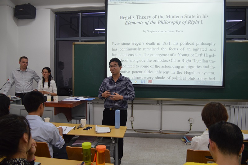 在斯蒂芬教授长达两个小时精彩的报告演讲之后,是自由提问与讨论环节。总共有四名同学向斯蒂芬教授提出了问题,教授针对各个同学的疑问进行了细致而深刻的解答。最后,宋朝龙老师对会议主题作了总结:“德国古典哲学在一定意义上可以说是人文社会科学的引力中心,许多问题都是由德国古典哲学生发出来的。许多当今的实际问题回到德国古典哲学往往会有新的内涵,黑格尔的国家理论在当今依然有现实意义,值得我们去探讨和研究。也希望大家继续关注我们接下来的系列讲座”。