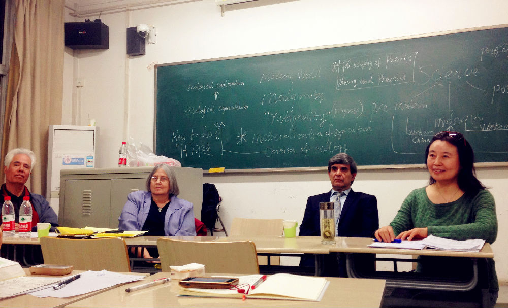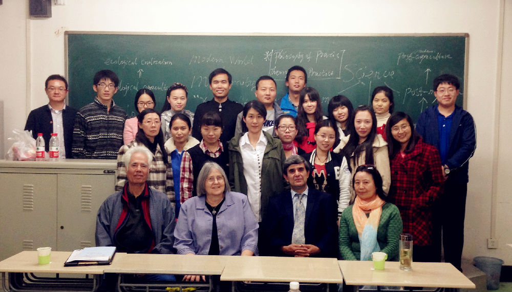 部分硕士和博士研究生等交流了受同学们欢迎的学术话题:《国家的财富还是健康——资本主义内部的转换》和《全球危机时代的环境政治学》。他们在建设性后现代主义立场下,坚持解构与建构的统一,运用过程哲学思维方式,针对现代世界的生存危机,批判现代性特别是资本逻辑和所谓的“绿色革命”,并试图通过向传统学习以及发展生态农业等,来推动生态文明建设,寻求健康、和谐与人类共同福祉,以期拯救世界。此外,中国灾害防御协会灾害史专业委员会顾问陈一文出席本次学术活动,不仅志愿担当起翻译工作,还带来了个人的一些研究资料。