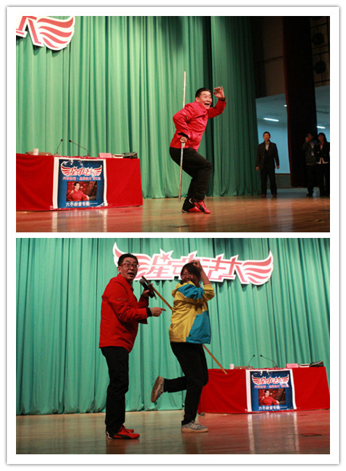 随后,章先生与学院领导和老师一起前往礼堂参加“星动法大”活动,作了一场题为“我的西游记忆”的报告会。在热烈的掌声中,章先生身着中国红的上衣入场。他用幽默的语言借用西游记四人的角色向到场观众问好,接着谈到了不久前六小龄童的“被死亡”事件。他指出,被死亡事件的频发某种程度上反映了我国法律在网络立法上的漏洞,加上不久前有关玄奘大师“灵骨塔”面临拆迁以及六小龄童肖像权侵犯的官司,更是让他意识到目前对于传统文化和艺术形象保护的法律缺失。他谦虚地表示此次来政法大学要向在座师生讨教,并对法律学子的成长成才寄予厚望。针对目前社会上一些恶搞传统文化和经典人物的现象,他态度鲜明的指出“中华民族的子孙,只有继承、创新、发展传统文化的义务,没有戏说、恶搞名著的权利”。结合自己拍摄《西游记》等电视剧过程中的种种磨难,他鼓励当代大学生要以玄奘取经的坚持精神去“苦练七十二变、笑对八十一难”,用乐观的心态和扎实的基本功去迎接毕业后的各种挑战。在学习和科研过程中做到“人无我有,人有我好,人好我精,人精我绝,人绝我化”。整个现场经典话语不断,掌声不断。章先生还回忆了拍摄西游时的场景,也通过现场互动跟同学们交流了对西游记的体悟。在章先生饱含深情的话语中,我们深切地感受到了老一辈艺术家们对艺术的执着热情与无悔付出。