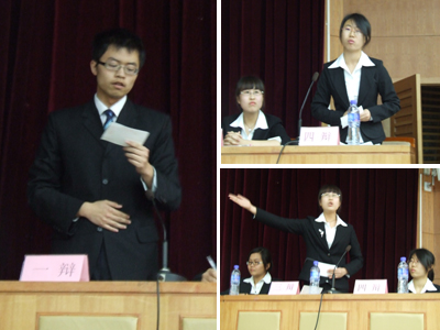 居反方位置,坚持“群体性事件阻碍中国社会发展”的观点。在第一环节中,双方均以精彩的开场,赢得了观众热烈的掌声。接下来,是双方的立论陈词环节。对方刑事司法学院同学首先表明了他们的立场,认为群体性事件是民众表达自身利益的一种无奈之选;同时它暴露了社会问题,为社会改革提供了动力和方向。接着,我方一辩温文尔雅,从群体性事件所具有的复杂性、突发性和传染性三个特点入手,阐述了群体性事件的非理性特点,指出它本质上并不是社会改革的手段;而且群体性事件容易造成社会混乱,不利于社会的长期发展和改革的深入;最重要的是,不应以民众生命为赌注,将利益的获得寄希望于一场豪赌,认为群体性事件会阻碍社会改革的发展。比赛第二个环节是攻辩环节,我方坚持认为,对方以历史结果代替历史过程的逻辑论断存在问题,而将群体性事件与改革等同起来的说法更值得怀疑。正方则不断抛出个例,以反驳我方的质疑。在攻辩小节之后,比赛进入最为激烈的自由辩环节,双方辩手你来我往,敏捷的思维、优秀的口才和良好的应战能力令现场气氛骤然升温。我方在承认群体性事件对社会改革有积极方面的前提下,提出社会改革应在特定的环境中进行。最后一个环节是总结陈词,两方四辩梳理思路,重申观点,层层深入,严谨的思维和饱含真情的语言给观众留下深刻印象。整个辩论过程双方都有充分的准备,引经据典、唇枪舌战,严肃而且激烈,观众在和谐气氛中再次沐浴了法大思辩之风。