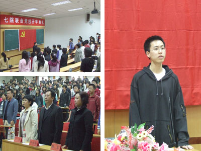 阮广宇老师首先对党校的学员们表示了热烈欢迎,并就党校的基本情况及主要学习任务向大家作了介绍,使大家对此次培训有了初步的认识。在奏唱国歌之后,由来自政治与公共管理学院的左自力同学代表发言。他恰当地引用人民日报社论,阐述了进入党校学习的原因及意义,号召大家认真学习,了解国内国际形势,尽最大能力为祖国作贡献。