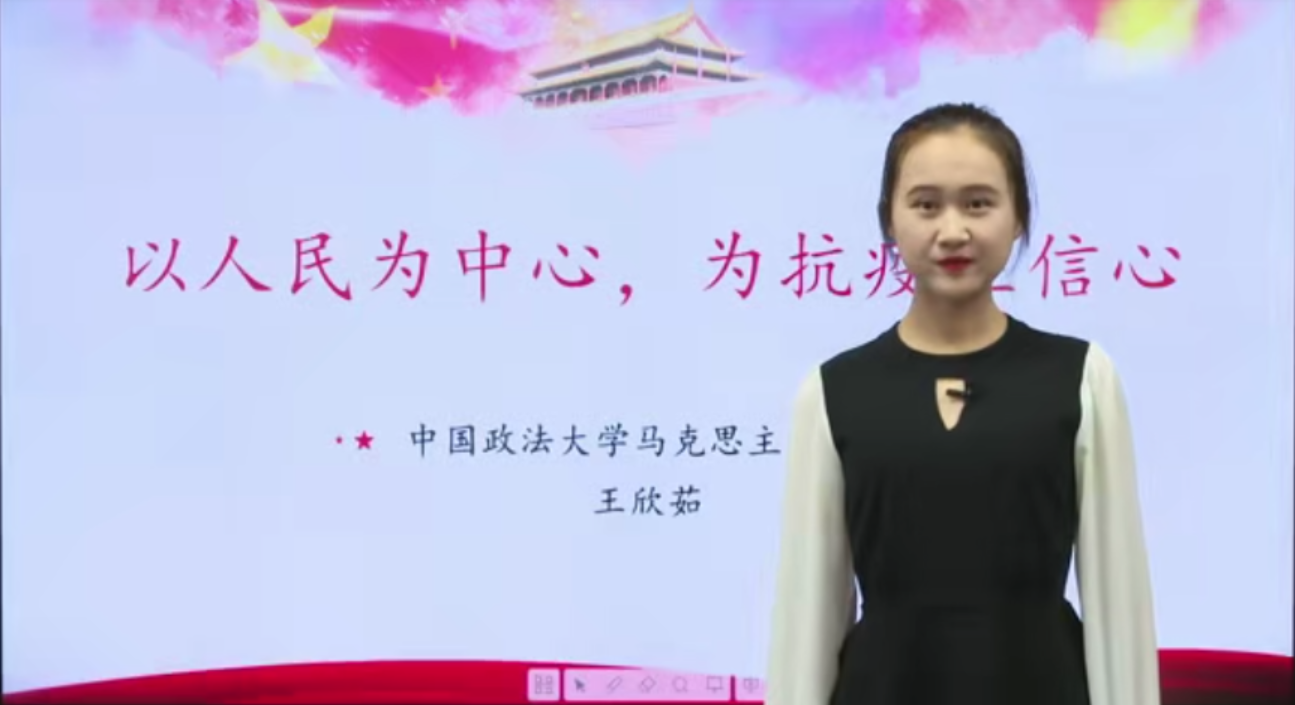 比赛中,王欣茹同学的讲课作品紧扣主题,结构清晰,娓娓动人。课程讲述以疫情期间所接触的三个人物故事切入,分别从仰视、平视和俯视的角度观察疫情,以小见大,引入授课主题和重点,讲述抗击疫情过程中党和国家坚持以人民为中心的价值遵循。继而分别从“一切为了人民”和“一切依靠人民”两个角度展开对“坚持以人民为中心”的阐述和讲解,其中广泛引用翔实数据和真实事件作为支撑。最后,结合习近平总书记于4月20日赴陕西省柞水县金米村考察脱贫攻坚,讲述“坚持以人民为中心是决胜全面建成小康社会的重要指导思想”。