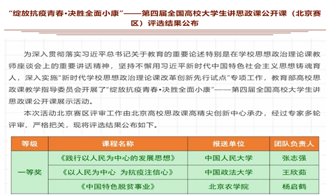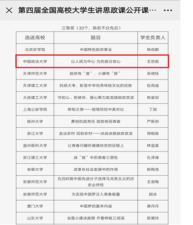 2018级本科生王欣茹主讲的“以人民为中心,为抗疫注信心”课程继初赛获得北京市一等奖之后,在全国决赛中荣获国家三等奖。
