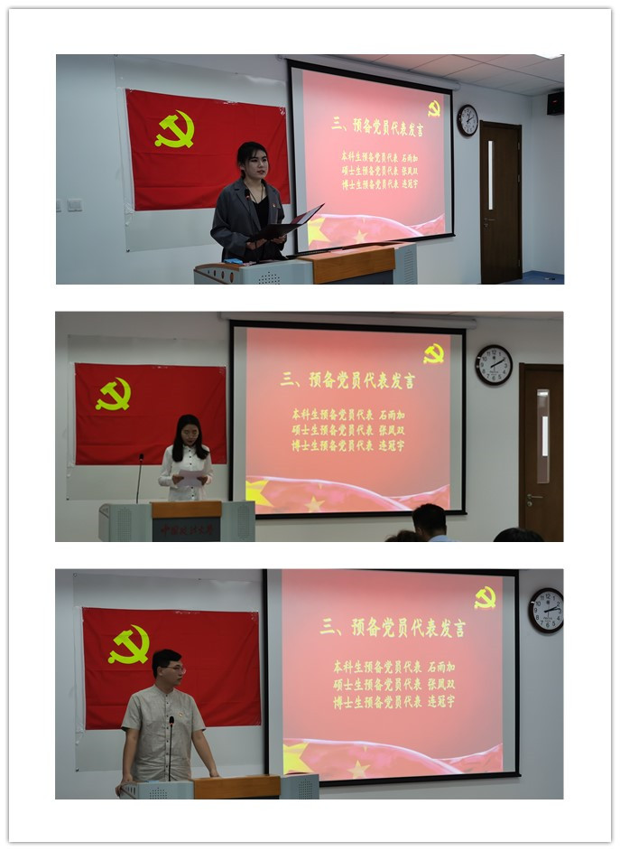 本科生石雨加、硕士研究生张凤双和博士研究生连冠宇分别代表本硕博预备党员进行发言。石雨加讲述了自己从递交入党申请书到加入党组织以来的心路历程,代表全体本科生预备党员做出了响应党中央号召,加强自身党性修养,做到从组织上、思想上和行动上入党的宣言。张凤双向党组织表达了提高自身党性修养,矢志不渝跟党走的四个决心,感谢党组织的培养和考验。连冠宇讲述了革命先辈们身上值得我们当代青年党员学习的品质,代表博士生预备党员向党组织做出了青年党员当为国家富强而奋斗的庄严承诺。