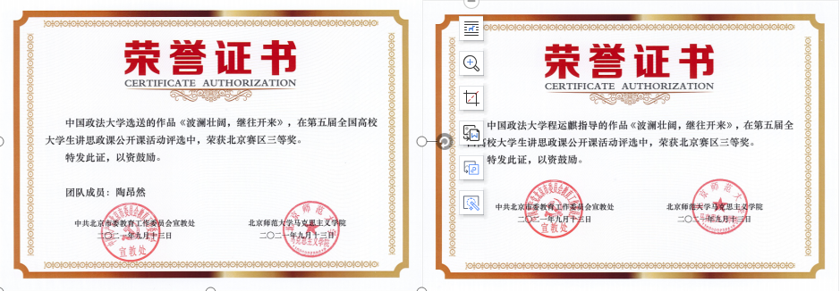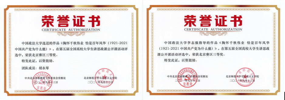 王欣茹同学主讲的作品《以人民为中心 为抗疫注信心》荣获北京赛区一等奖,并代表北京市参加全国高校大学生讲思政课公开课展示活动,荣获全国三等奖。