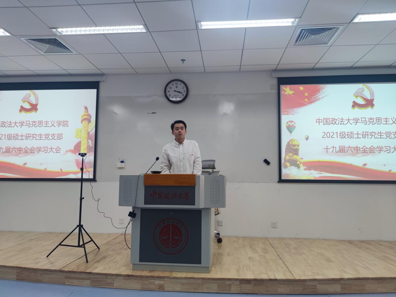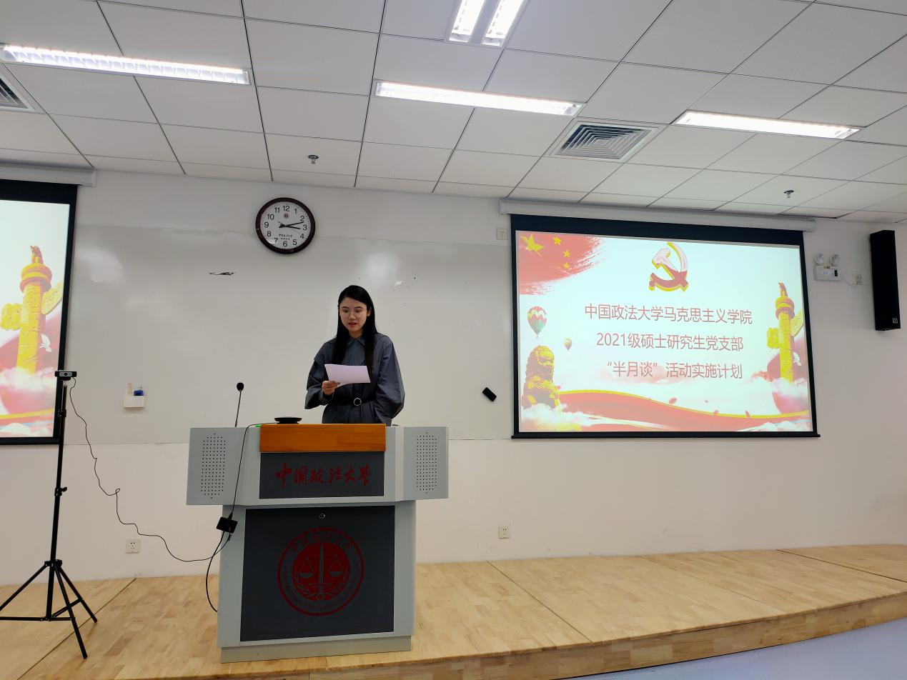 支部组织委员王淳以党的十九届六中全会会议精神为指导,为坚持党的领导,加强党的凝聚力,推出了2021级硕士研究生党支部策划的“半月谈”活动,得到了全体党员一致通过。她表示,正值党的十九届六中全会召开之际,我们党支部开展“半月谈”活动,旨在紧跟时政热点,提高理论水平,加强支部成员之间的沟通,增强党支部的凝聚力。通过“半月谈”活动,同学们认真学习党的十九届六中全会精神,立志成为优秀的马克思主义者。