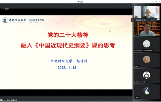11月18日,中国近现代史研究所举办党的二十大精神进课堂集体备课会,邀请马克思主义理论研究和建设工程重点教材课题组专家、中央财经大学赵付科教授做“党的二十大精神融入《中国近现代史纲要》课的思考”专题报告,备课会由中国近现代史研究所所长王强教授主持,课程组全体教师参加。