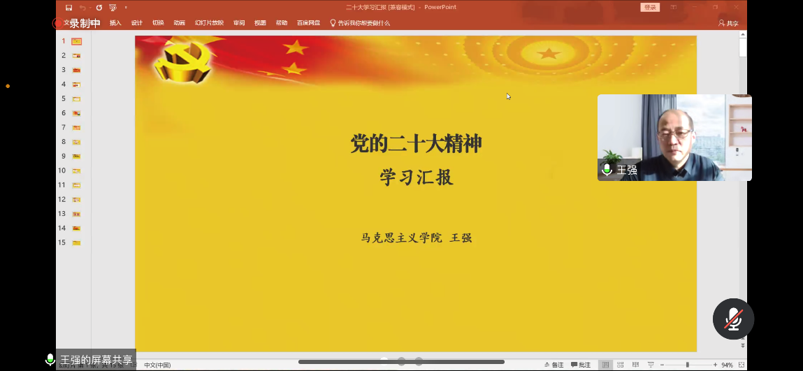 学习宣传贯彻党的二十大精神是当前和今后一个时期的首要政治任务。为帮助支部党员全面准确学习领会党的二十大精神,切实用党的二十大精神指导实践,12月1日下午,理论学习导师王强以“党的二十大精神学习汇报”为主题为2019级博士研究生党支部讲授专题党课,支部党员积极参加学习活动。