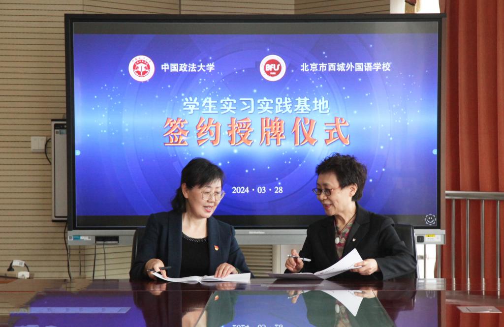 随后,执行院长邰丽华与西城外国语学校校长范雪梅共同签署共建学生实习实践基地协议书并进行了授牌仪式。
