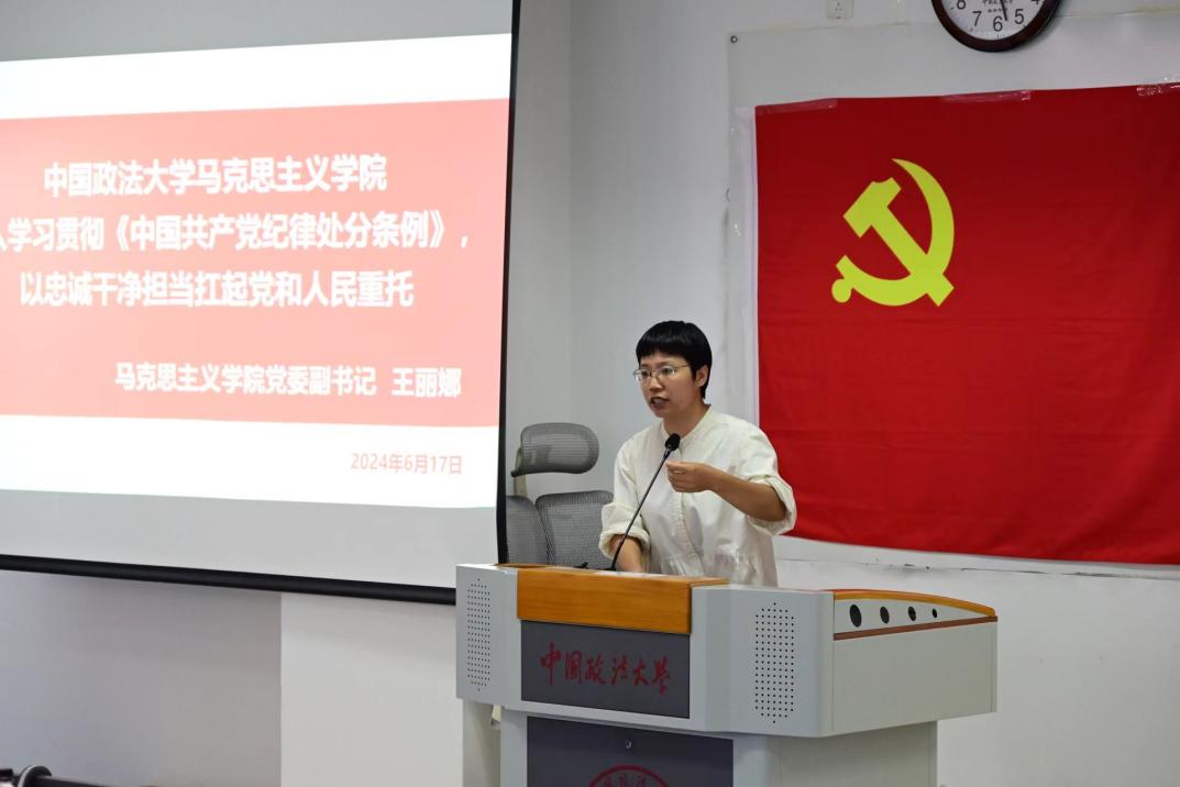 随后,王丽娜以“学习贯彻《中国共产党纪律处分条例》,以忠诚干净担当扛起党和人民重托”为主题,从纪律严明是党的光荣传统和独特优势、加强纪律建设是新时代全面从严治党的治本之策,并以总则为例,谈了如何以贯穿党的创新理论的立场观点方法引领党纪学习教育。