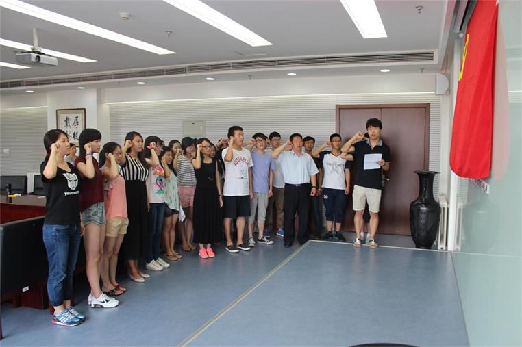 在支部组织委员叶恒达的带领下,全体与会成员面对党旗,举右手宣誓,帮助大四毕业生党员重温入党誓词。