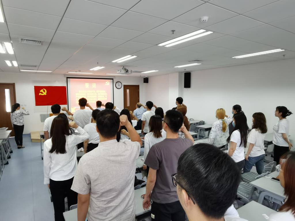 学院党委书记阮广宇领誓,全体预备党员面对党旗,庄严宣誓:我志愿加入中国共产党,拥护党的纲领,遵守党的章程,履行党员义务,执行党的决定,严守党的纪律,保守党的秘密,对党忠诚,积极工作,为共产主义奋斗终身,随时准备为党和人民牺牲一切,永不叛党。铿锵有力的宣誓声响彻整个会场。