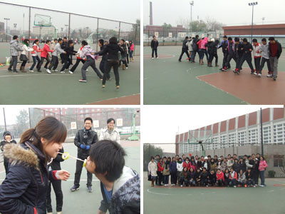 在篮球场上展开了一场别开生趣的运动会——趣味运动会。参加运动会的有11级的新生和部分大二、大三学生。