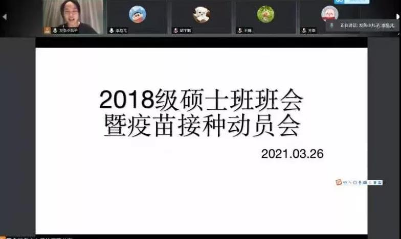 同时为更好地完成海淀校区的疫苗接种工作,研究生各班级分别组织召开新冠疫苗接种动员会。2018级硕士毕业班的同学们也积极响应学校号召,于3月26日召开了主题班会暨疫苗接种动员会。班会采取线上会议模式,全班同学均参会。在会上,班长对接种新冠疫苗进行了充分动员,并对疫苗接种的相关事宜和注意事项进行了详细介绍。班会让同学们对新冠疫苗及其接种有了更为全面的认识,同学们纷纷表示一定积极主动接种疫苗,携手共筑防疫屏障。