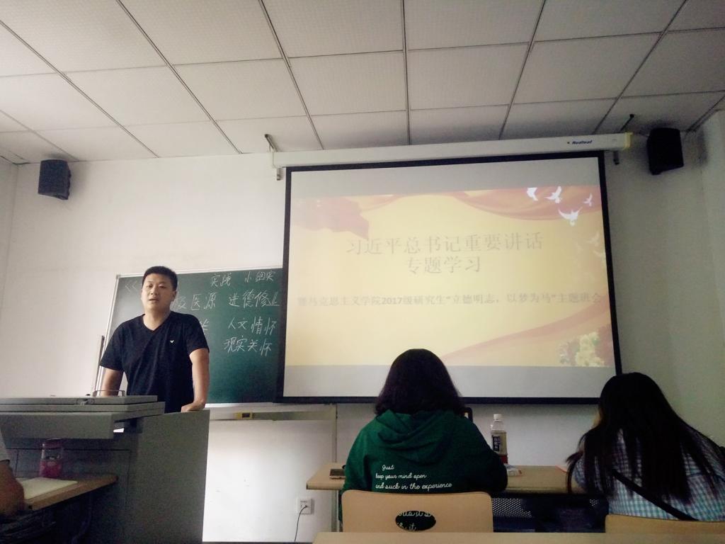 2017级研究生新生在新一号楼C102召开习近平总书记“5•3”重要讲话精神专题学习活动,暨“立德明智,以梦为马”主题班会,会议由2017级硕士党支部书记姜浩主持。