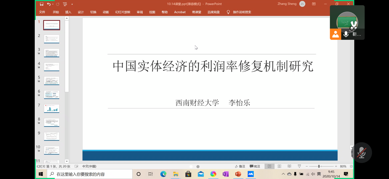 10月14日,本轮讲座的第五期主讲人是西南财经大学经济学院副教授李怡乐老师,题目为《我国实体经济的利润率修复机制研究》。本次讲座立足于全球生产体系演变动态与中国经济增长模式变化的背景,借助马克思主义经济学利润率的影响因素分解,分析了我国实体经济可能存在的利润挤压、产能过剩、产出-资本比下降,探寻了“空间修复”“技术修复”“产品修复”等利润率一般修复机制的可行性。以此为线索,理解党的十九大以来建设现代化经济体系的内在逻辑。
