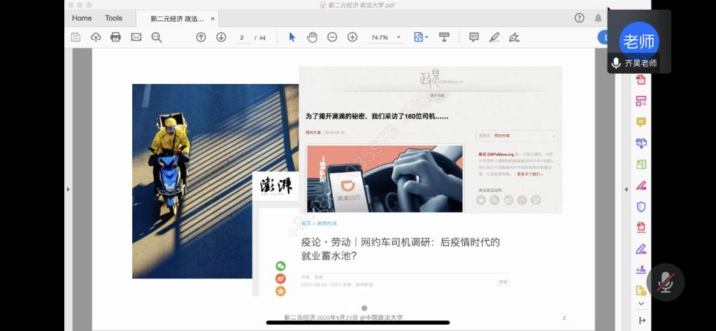 9月9日,本轮讲座的第一期主讲人是四川大学经济学院副教授骆桢老师,题目为《后疫情时代的中国宏观经济形势》。本次讲座基于历史唯物主义和马克思的宏观经济学分析,从传统的两对矛盾概念的动态关系出发,引入分工和生产力发展的框架,引出分工下的权力关系演变。在这个基础上,分析我国市场经济的矛盾与宏观经济的困局与世界体系变迁与中美关系的现状(外部问题)。本次讲座围绕三个维度展开:1.分析后疫情时代的理论基础——历史唯物主义与宏观经济分析2.何以至此?——当前状况的产生原因3.后疫情时代——新技术、新格局、中美关系的新变化。