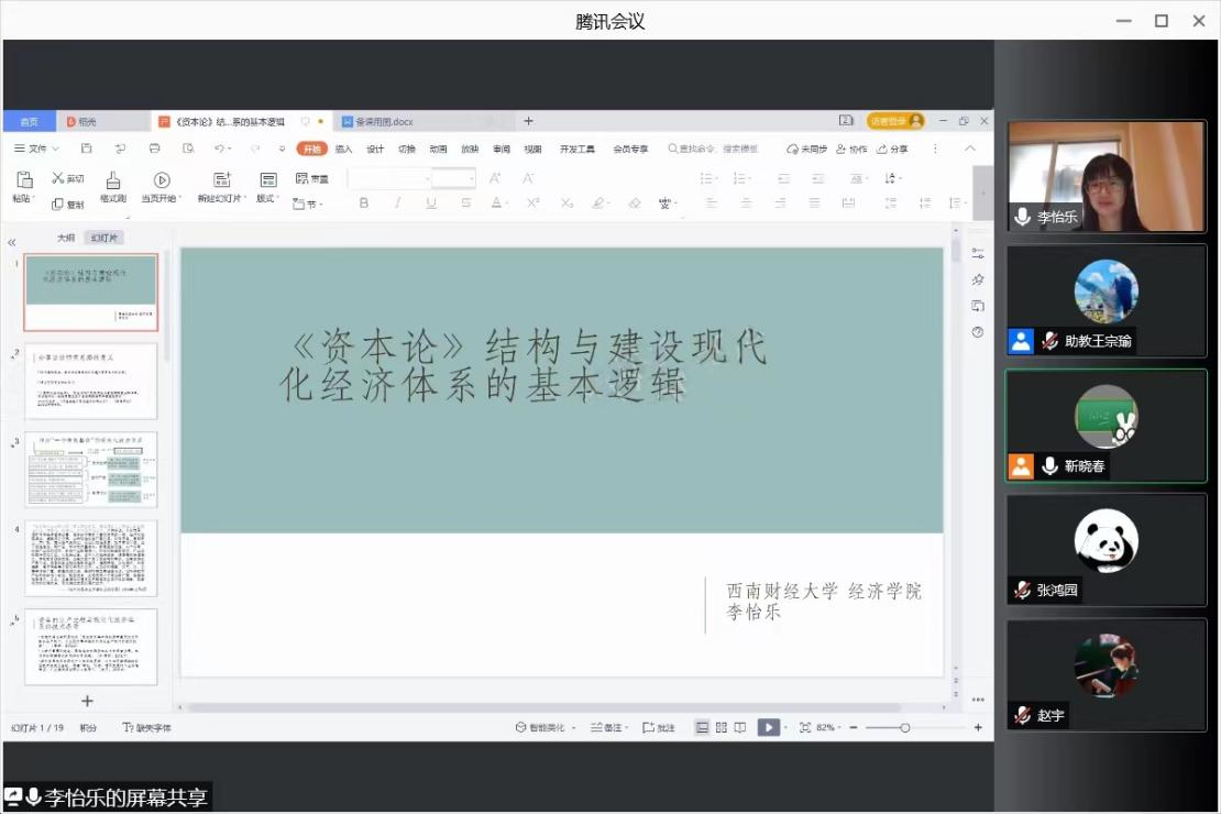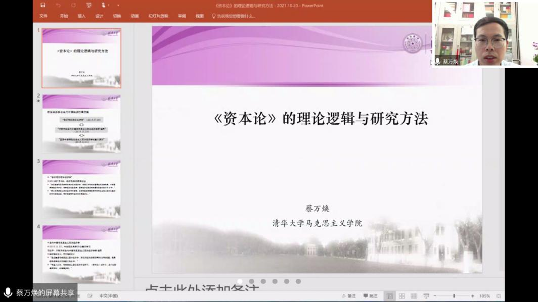的蔡万焕老师,题目为《<资本论>的理论逻辑与研究方法》。中国特色社会主义政治经济学理论体系是以马克思主义为指导,立足我国国情和我国发展实践,揭示新特点新规律,提炼和总结我国经济发展实践的规律性成果,把实践经验上升为系统化的经济学说。讲座以《资本论》的理论逻辑和研究方法为基础,为当前构建和发展中国特色社会主义政治经济学提供了理论方向与方法指导,为我们认识当前中国经济问题提供了科学的理论视角。