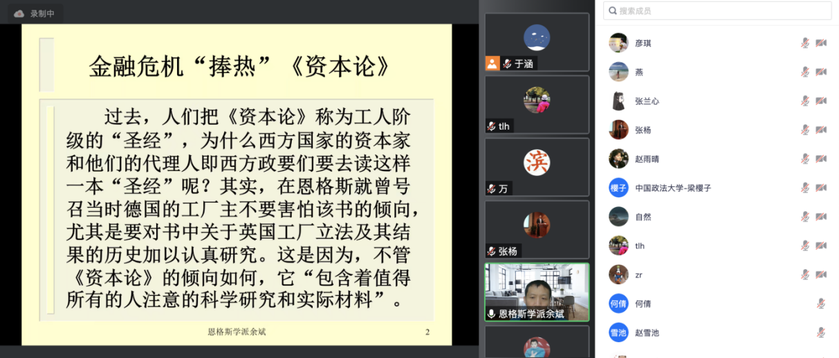 余斌研究员首先分析了金融危机“捧热”《资本论》,说明《资本论》的基本理论仍然是今天的人们宝贵的精神财富。其次,通过引用习近平同志重要讲话,强调学好用好政治经济学的重要性。接着,对资本主义生产方式及其矛盾进行分析,并围绕“什么是一块钱?”、“资本家不断从流通中取出的货币怎能比他投入的多?”、“为什么物价不上涨,也可能通货膨胀?”等多个问题,对资本主义生产的本质这一公式进行分析。最后,余斌研究员对同学们提出“多读原著”的建议,认为“读原著就像爬山一样,沿着陡峭的山路攀登才能到达光辉的顶点”。